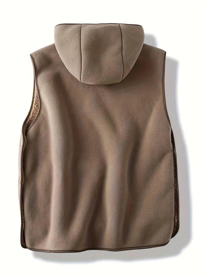 Chaleco casual con capucha de forro polar para hombre, tejido de punto de poliéster de corte ajustado con detalle de botones, color liso
